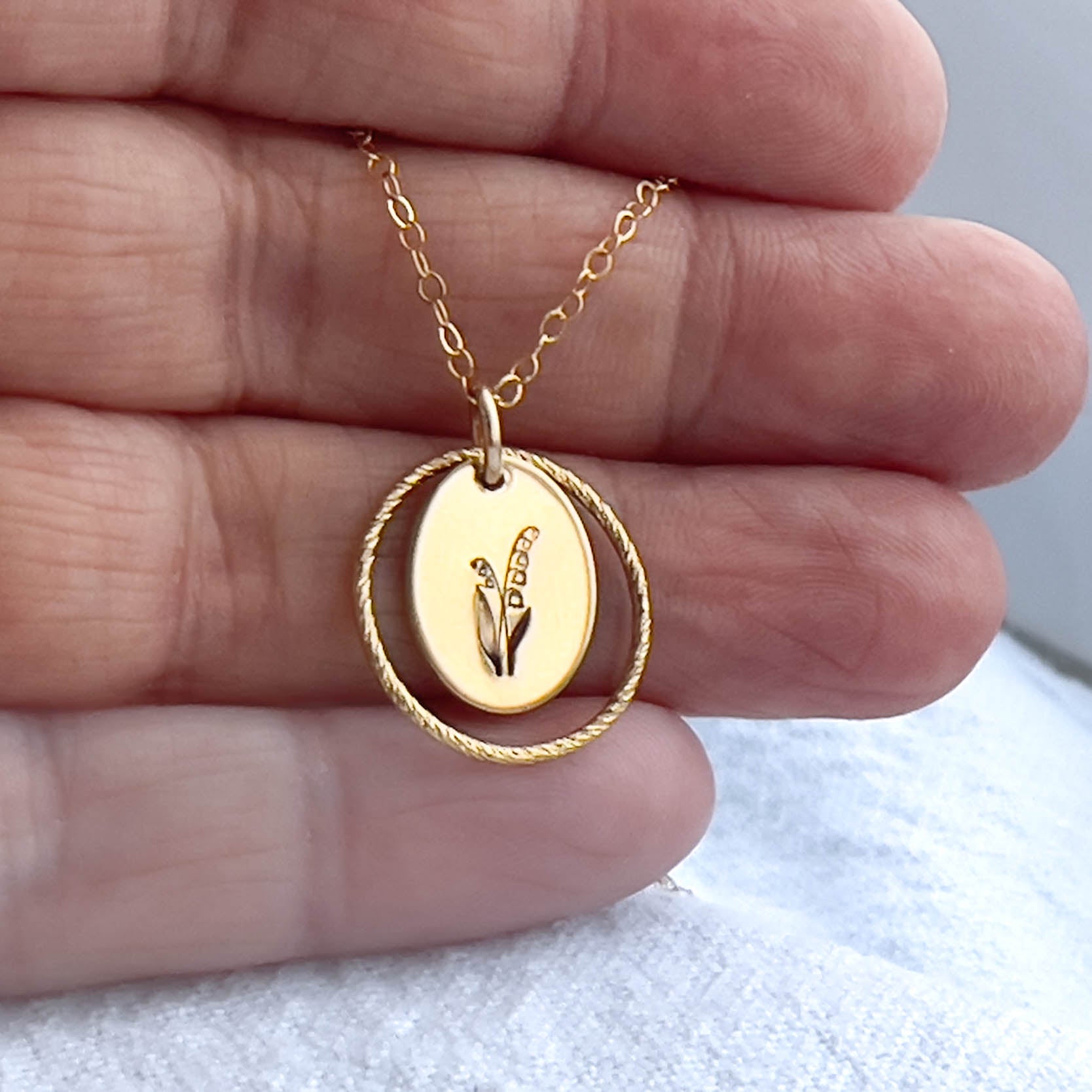 Each necklace features a gold-filled oval pendant hand-stamped with your chosen flower, from delicate daisies to classic roses to joyful poppies. The pendant measures approximately 1/2" x 1/2" and is paired with a textured gold-filled circle, adding a lovely layered effect. It hangs from an 18” gold-filled chain that’s lightweight, durable, and made for everyday wear. The necklace closes with a secure clasp, and its minimalist style makes it perfect for layering or wearing solo as a quiet statement of meaning and beauty.